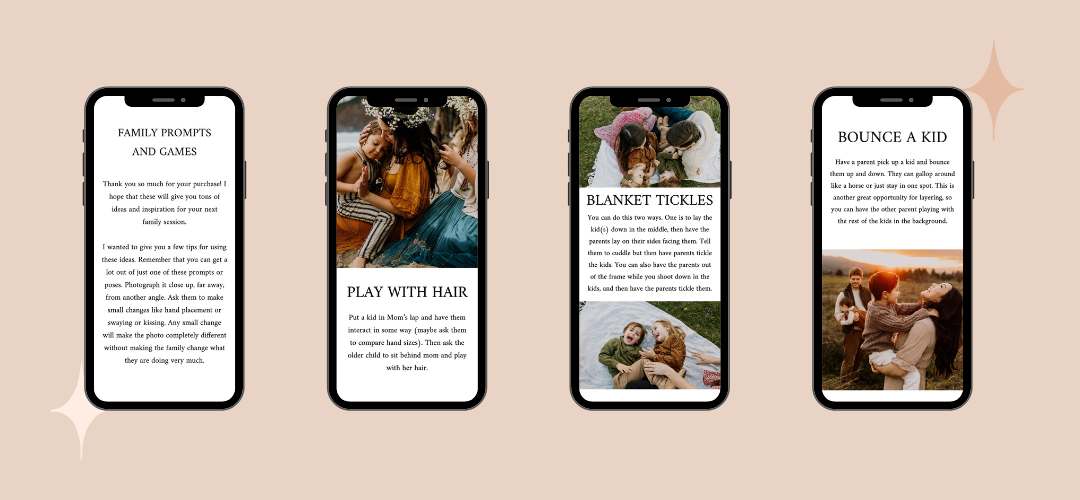 AYUMIFirst of all, wow, I LOVE this guide so much!! I’m simply blown away, this is amazing for any family photographer! It has such useful information. I love how you explain each pose in detail and a few options to do it. If one doesn’t work, I can try another thing you listed and can still get the same look/feels. I also love that most of poses are more like little activities. You will get so many great shots during one “pose”. They are also a good combination of close up and pull back shots, and we can get a great variety of shots.